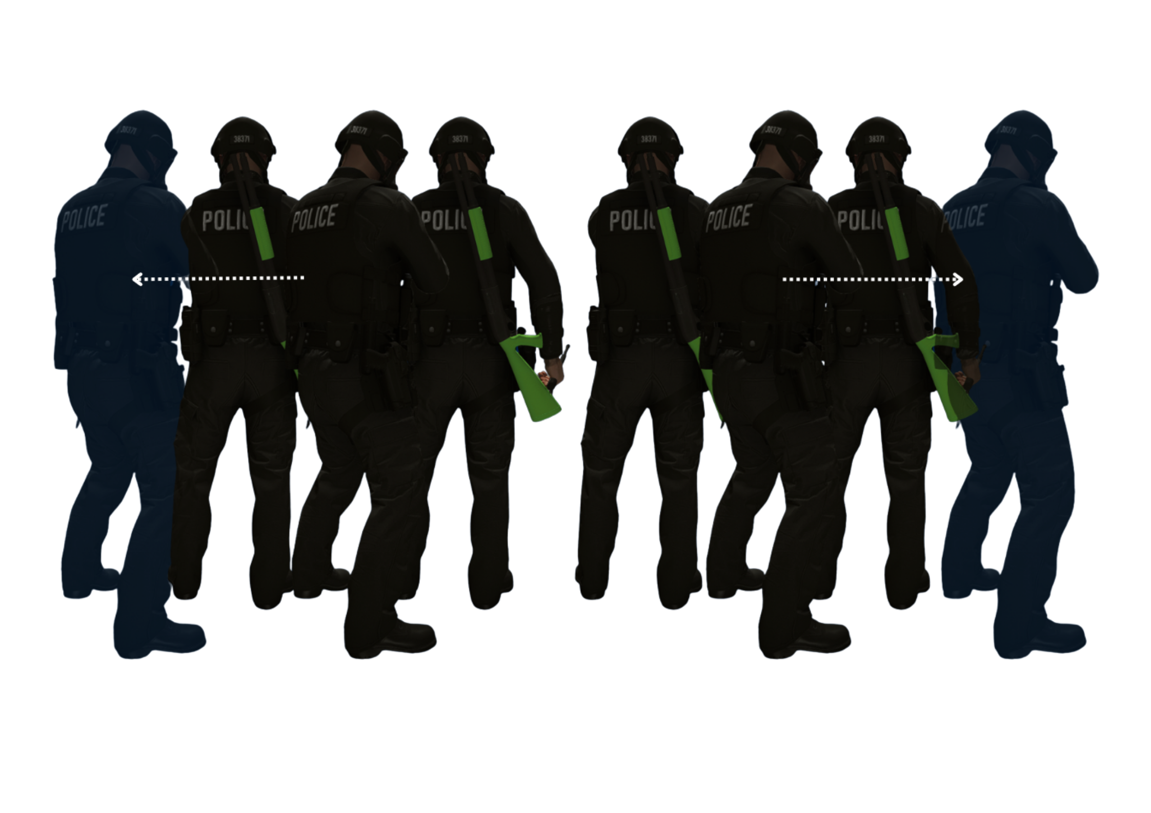 Le placement avec beanbag sur les extrémités est fait de sorte à permettre aux unités BEANBAG de se déplacer simultanément sur la gauche/droite afin d’avoir un nouvel angle de tir sans se gêner.
